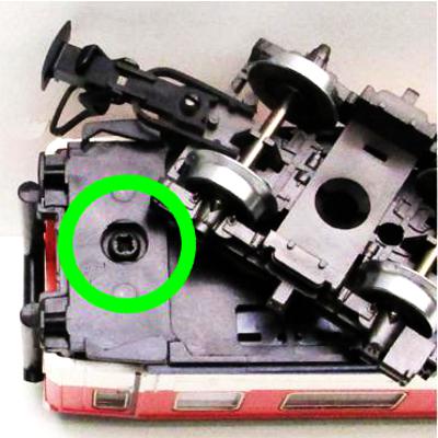 Schrauben unter den Drehgestellen entfernen. Siehe grüner Kreis.